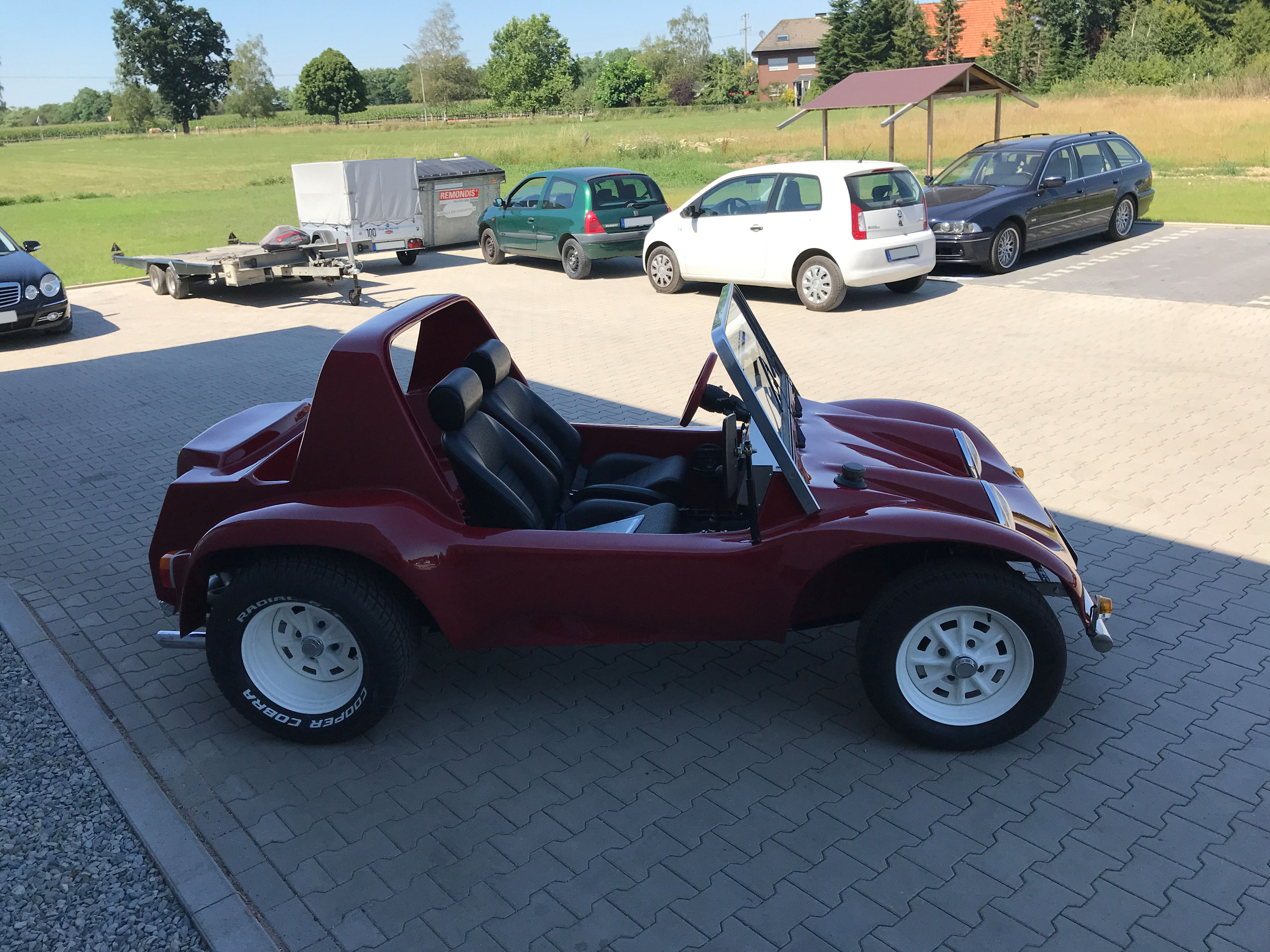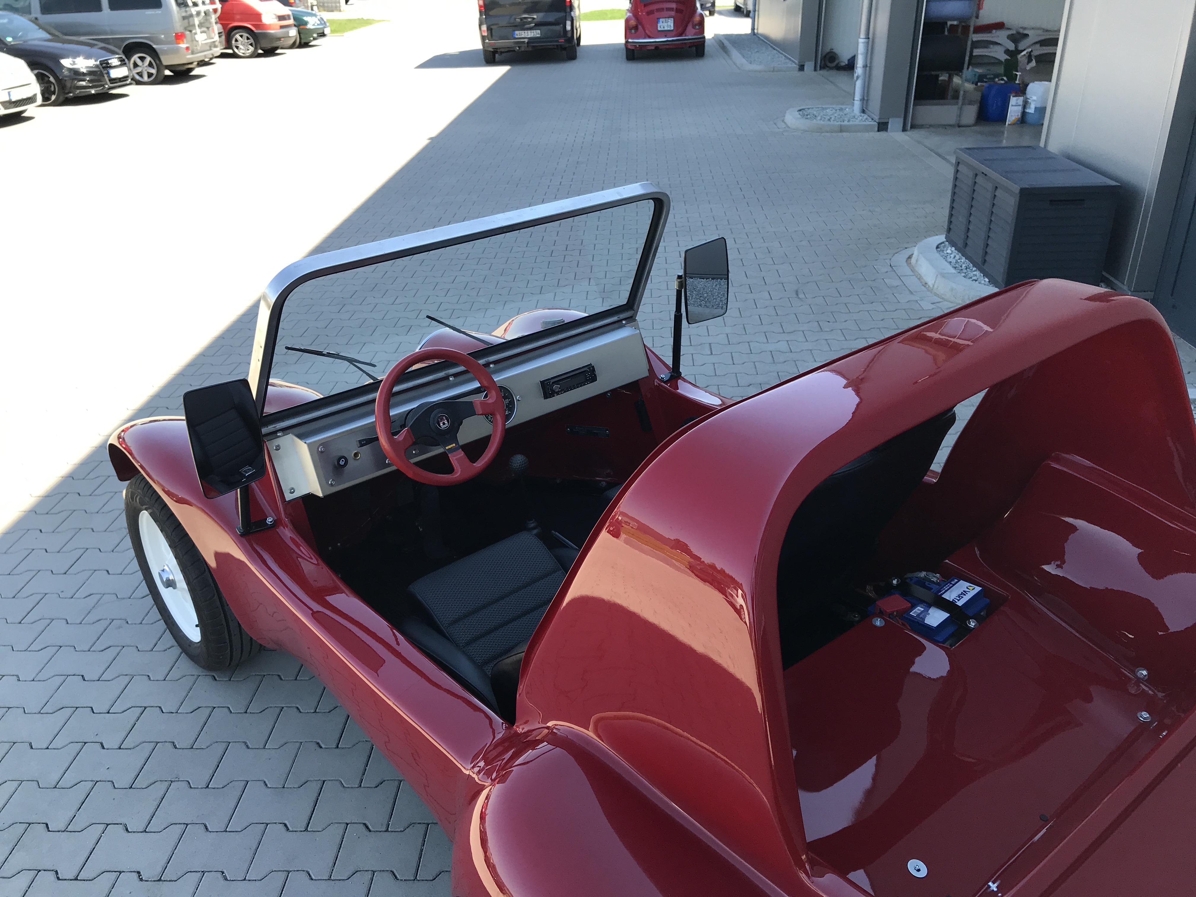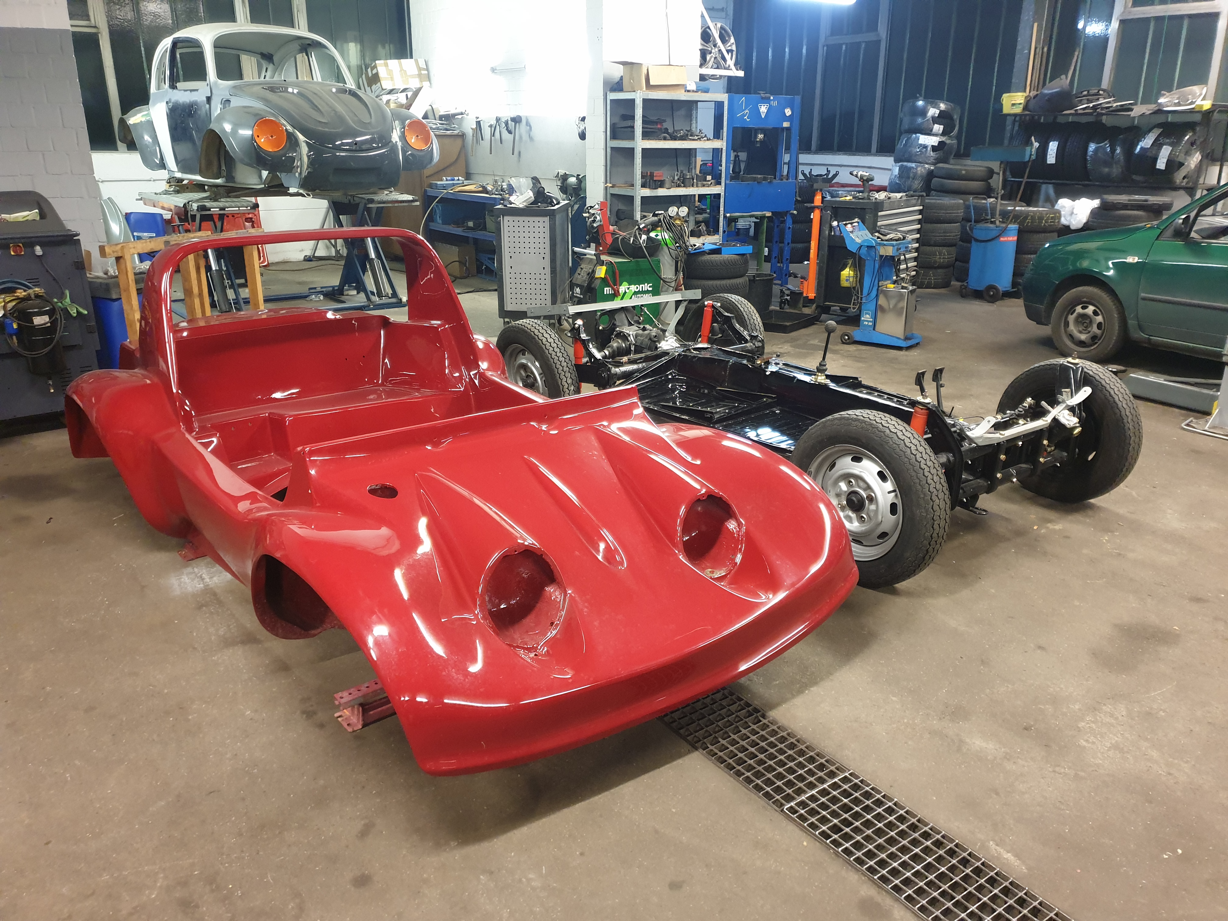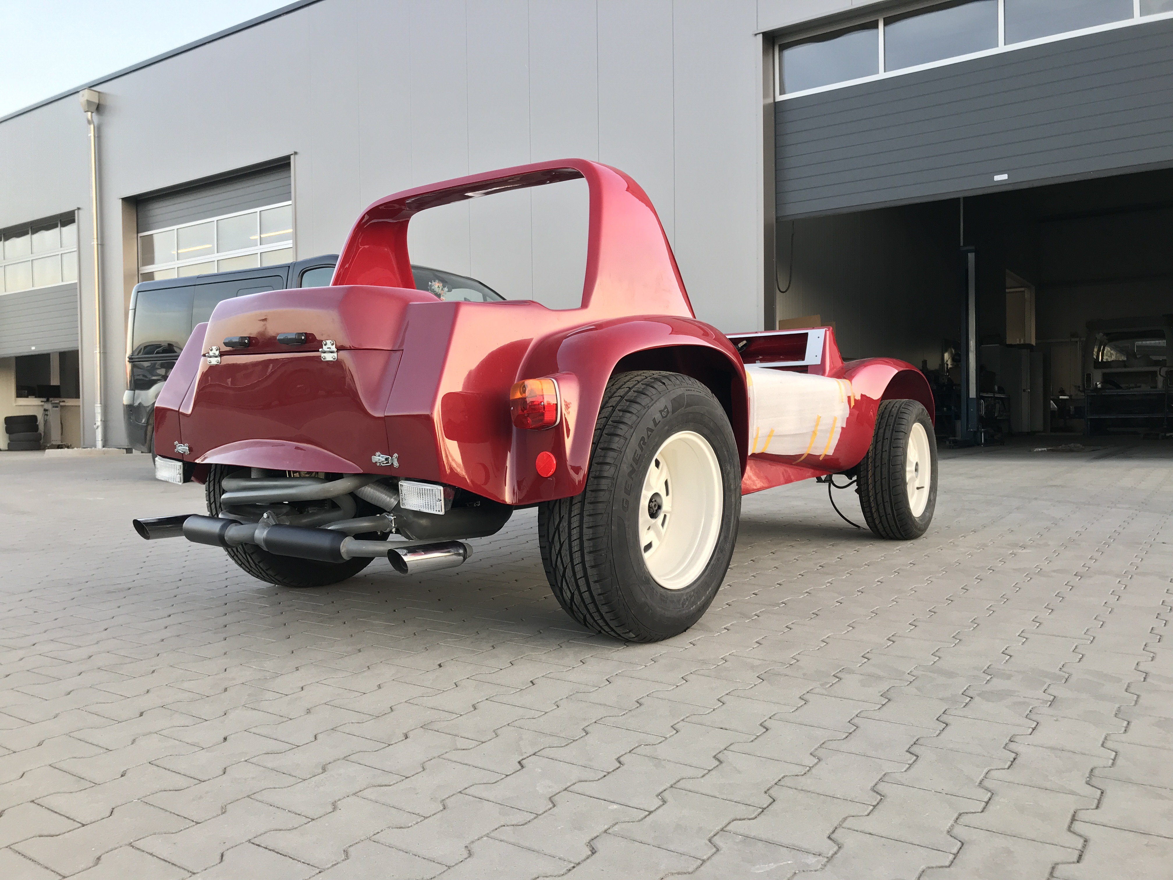 GFK Karosserie auf gekürztem VW Käfer Fahrgestell. Das Fahrzeug wurde nach Kundenwunsch komplettiert und modifiziert.