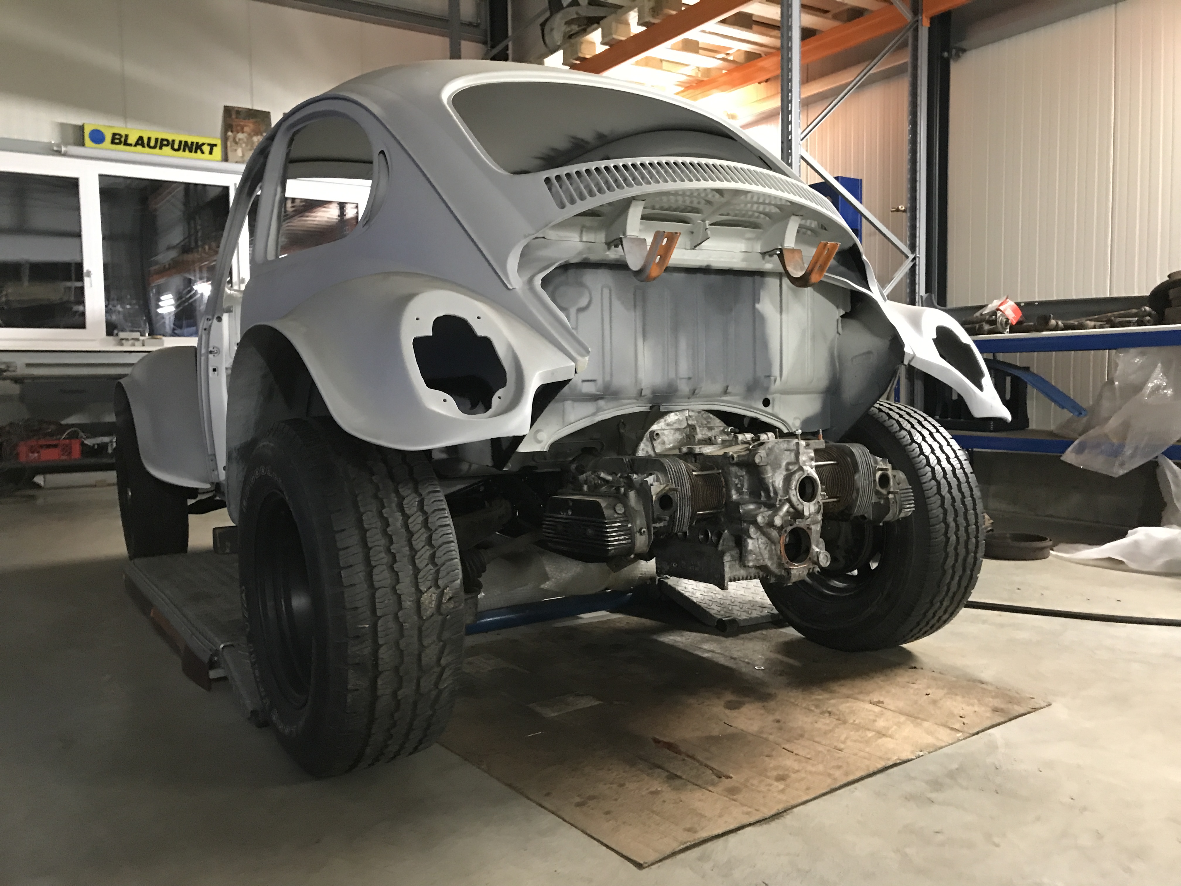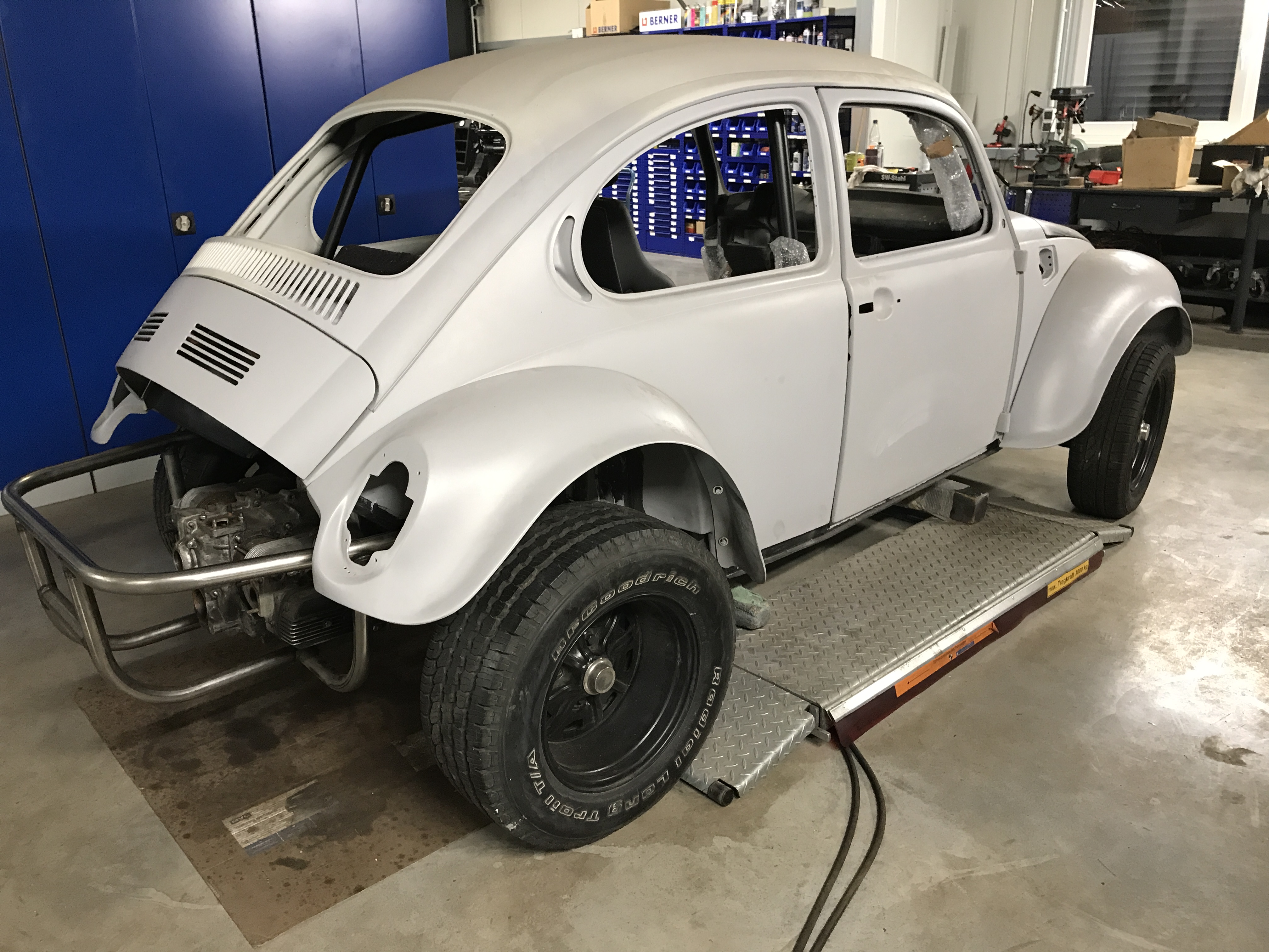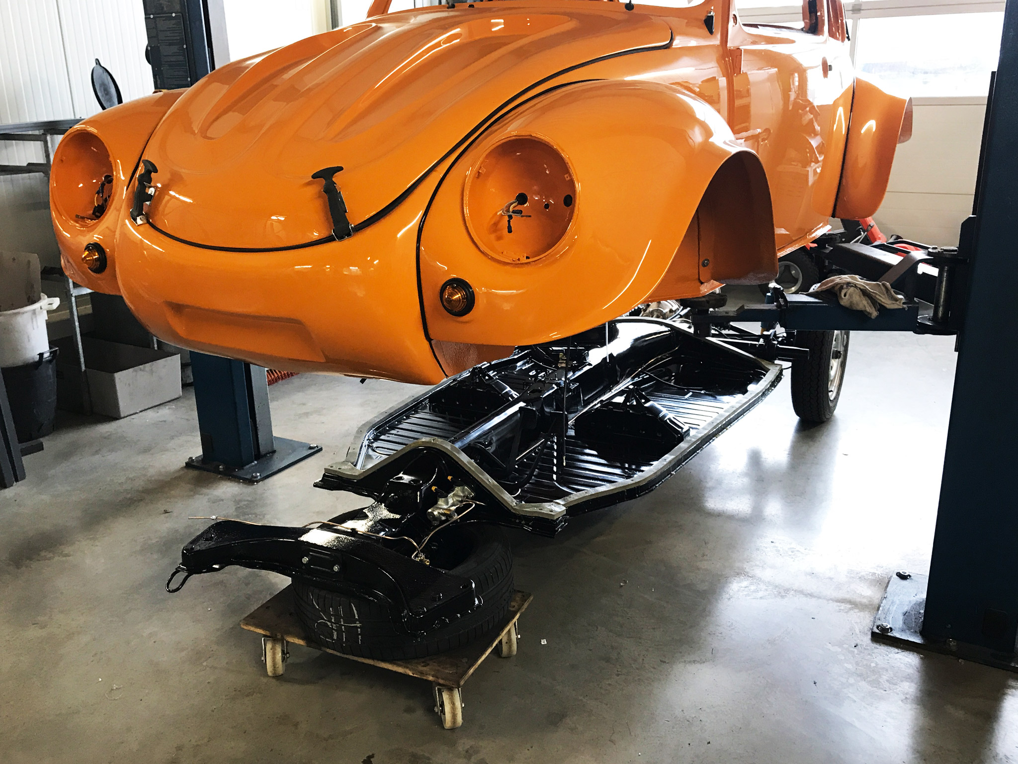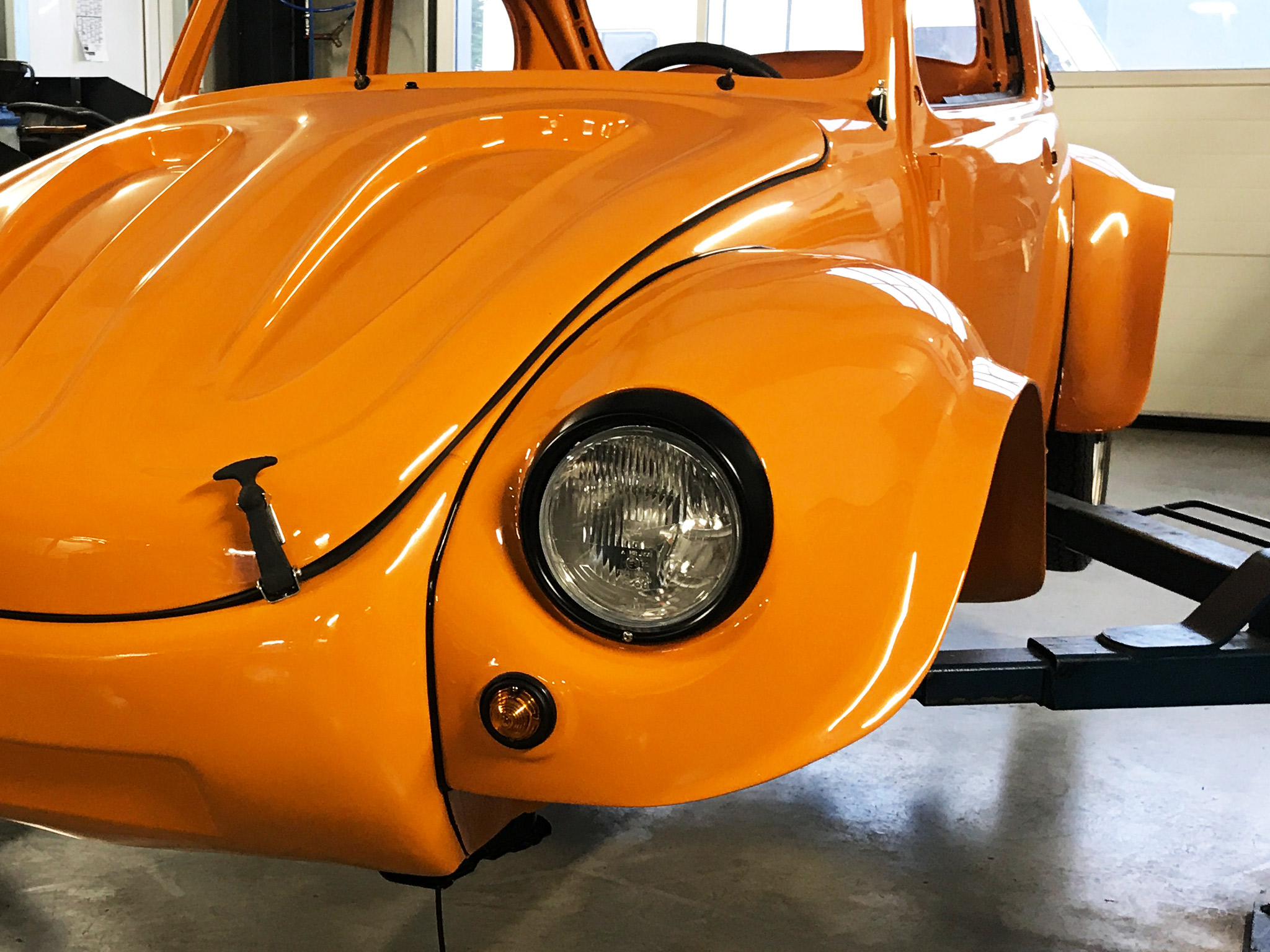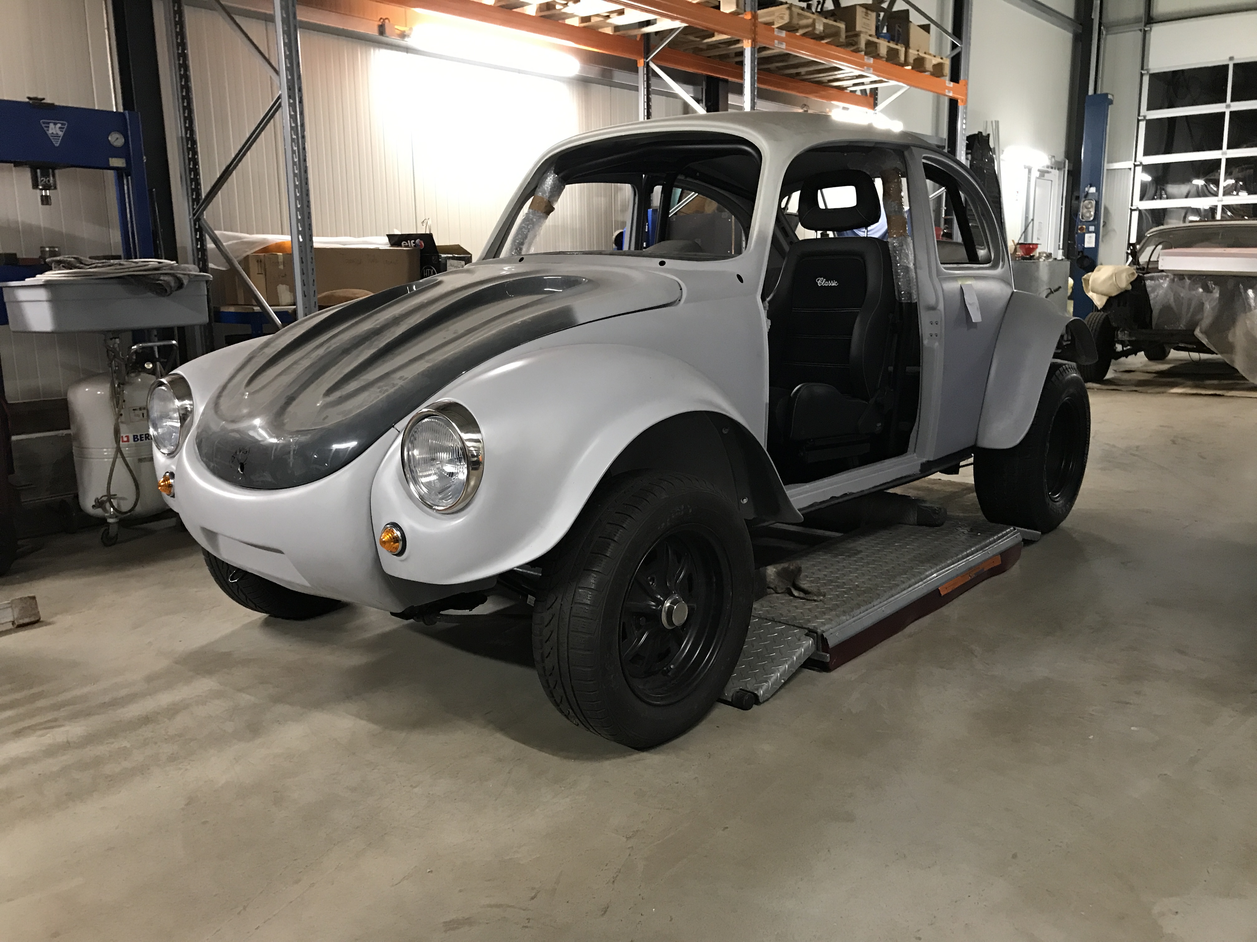 Neuaufbau eines 1303 mit gekürzter Front und Heck, GFK Hauben sowie verbreiterte Kotflügel. Dieses Umbau Kit wurde in den 70er Jahren von der Firma HAZ vertrieben, nur wenige Fahrzeuge haben davon überlebt. Das Basisfahrzeug wurde komplett zerlegt, sandgestrahlt, geschweißt und zum Schluß Epoxid grundiert. Die GFK Teile und Bleche wurden für eine perfekte Passgenauigkeit optimiert.