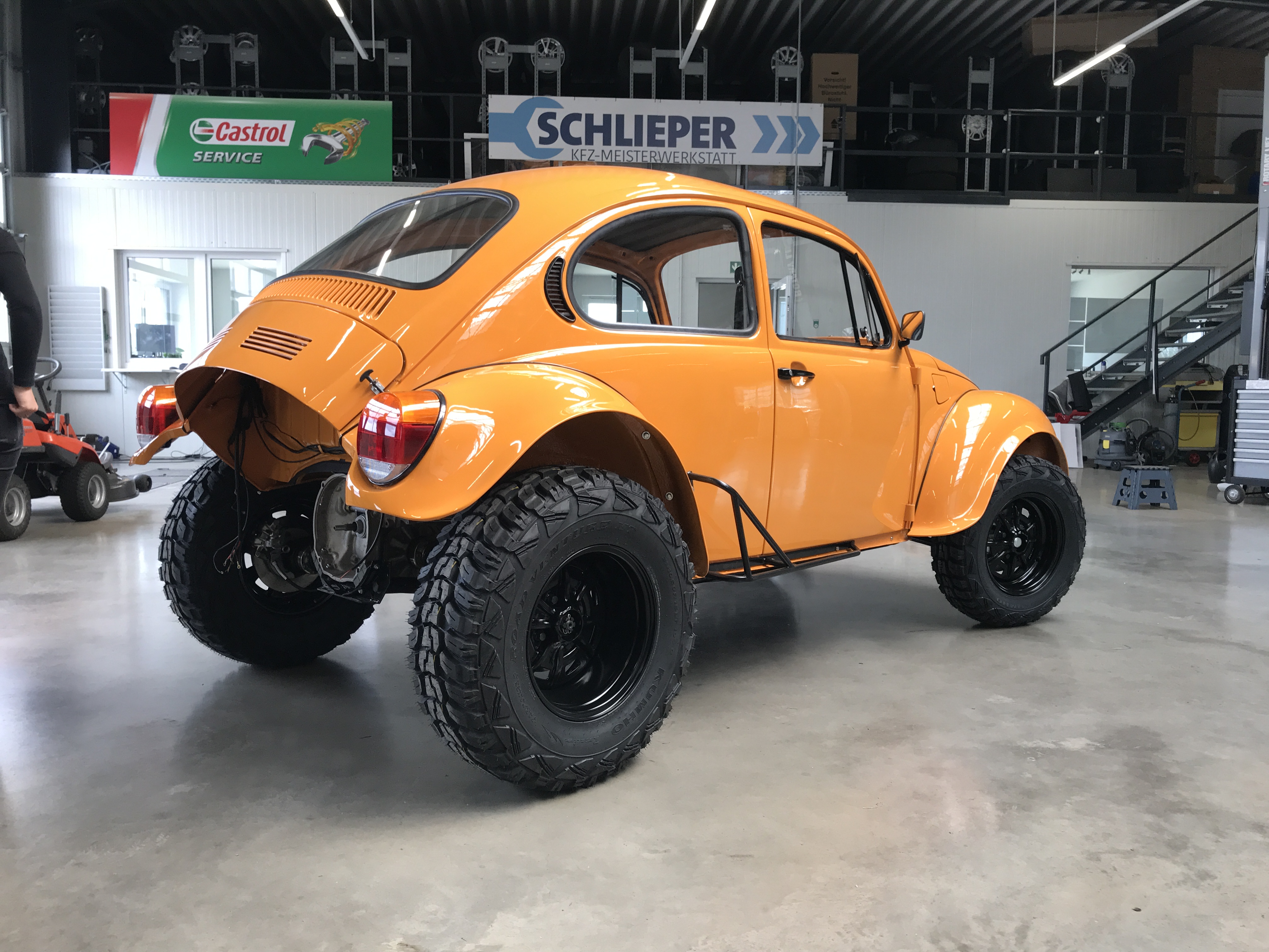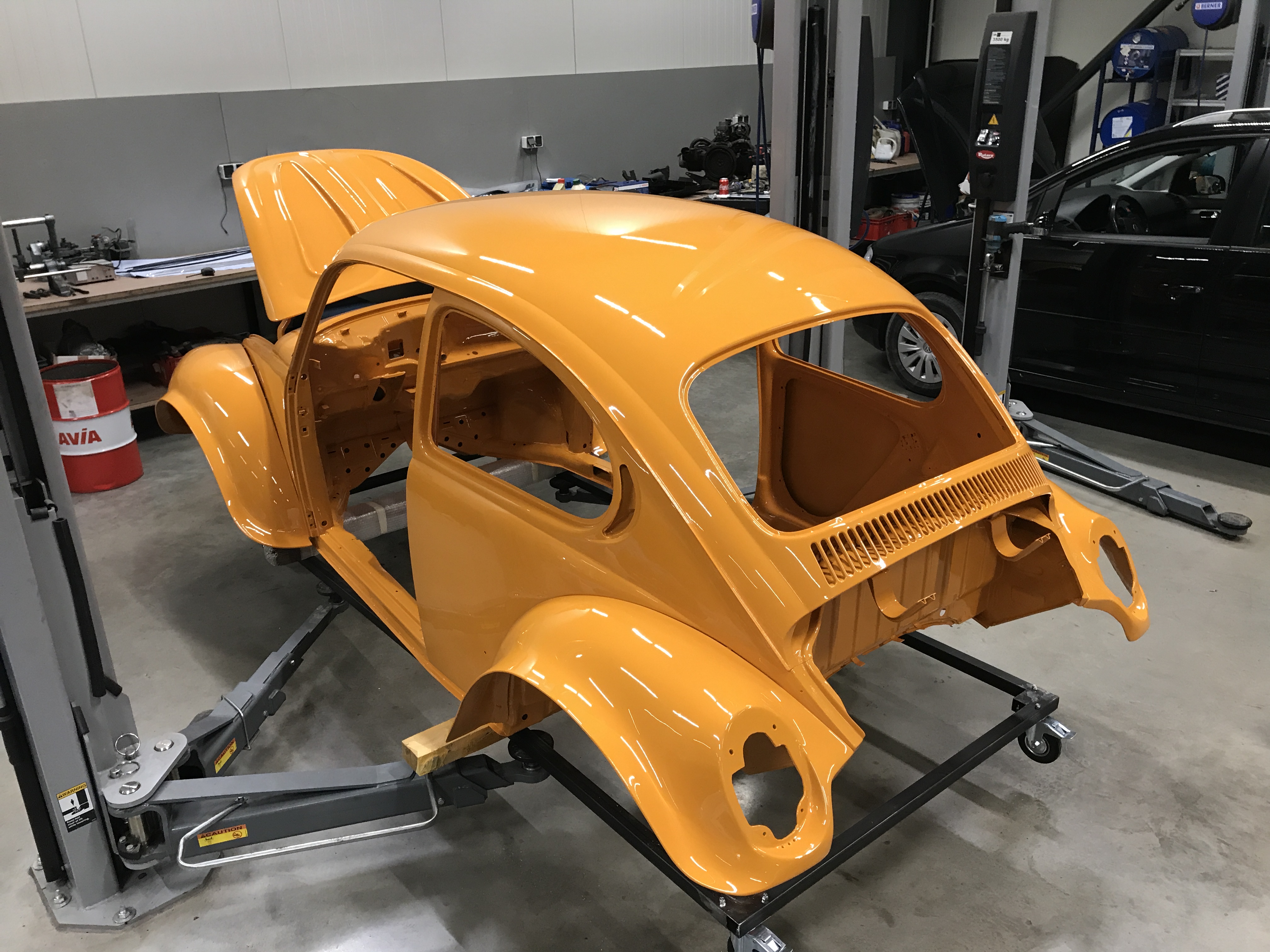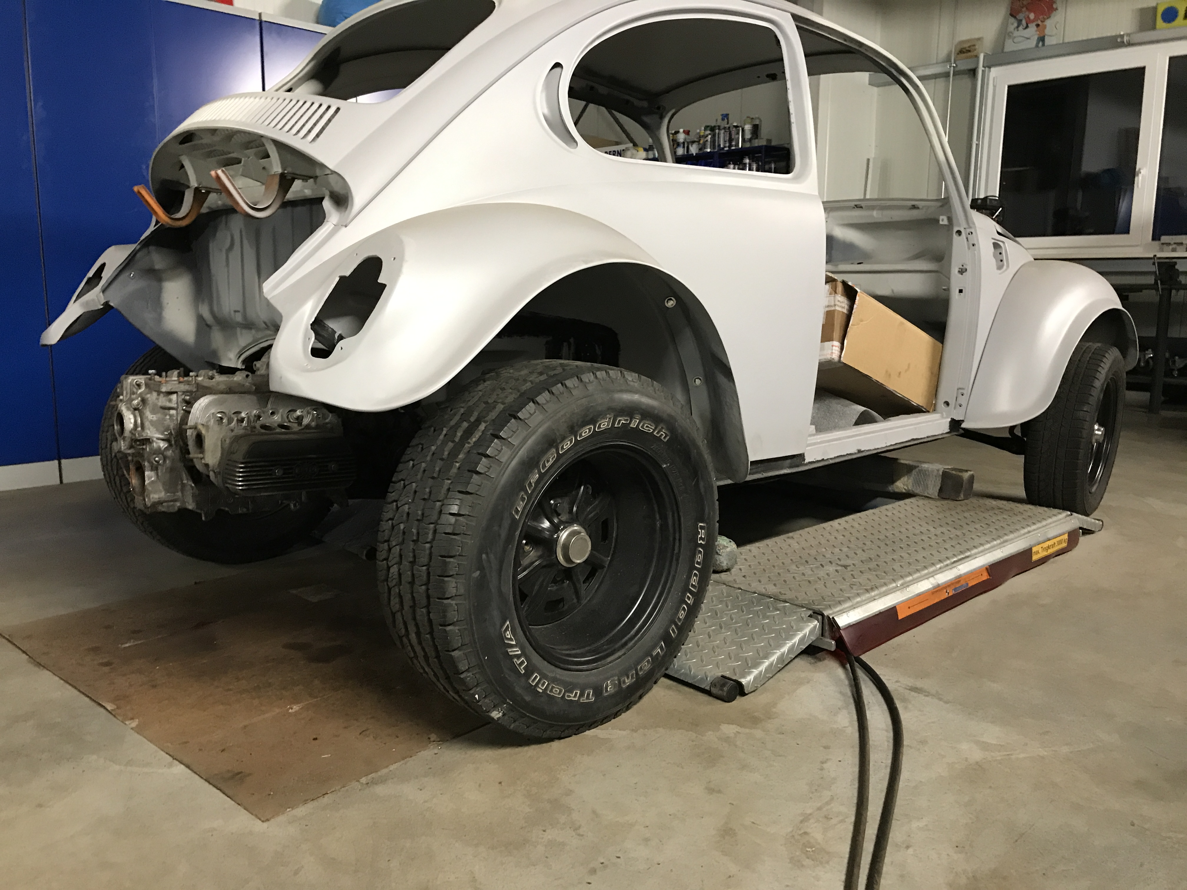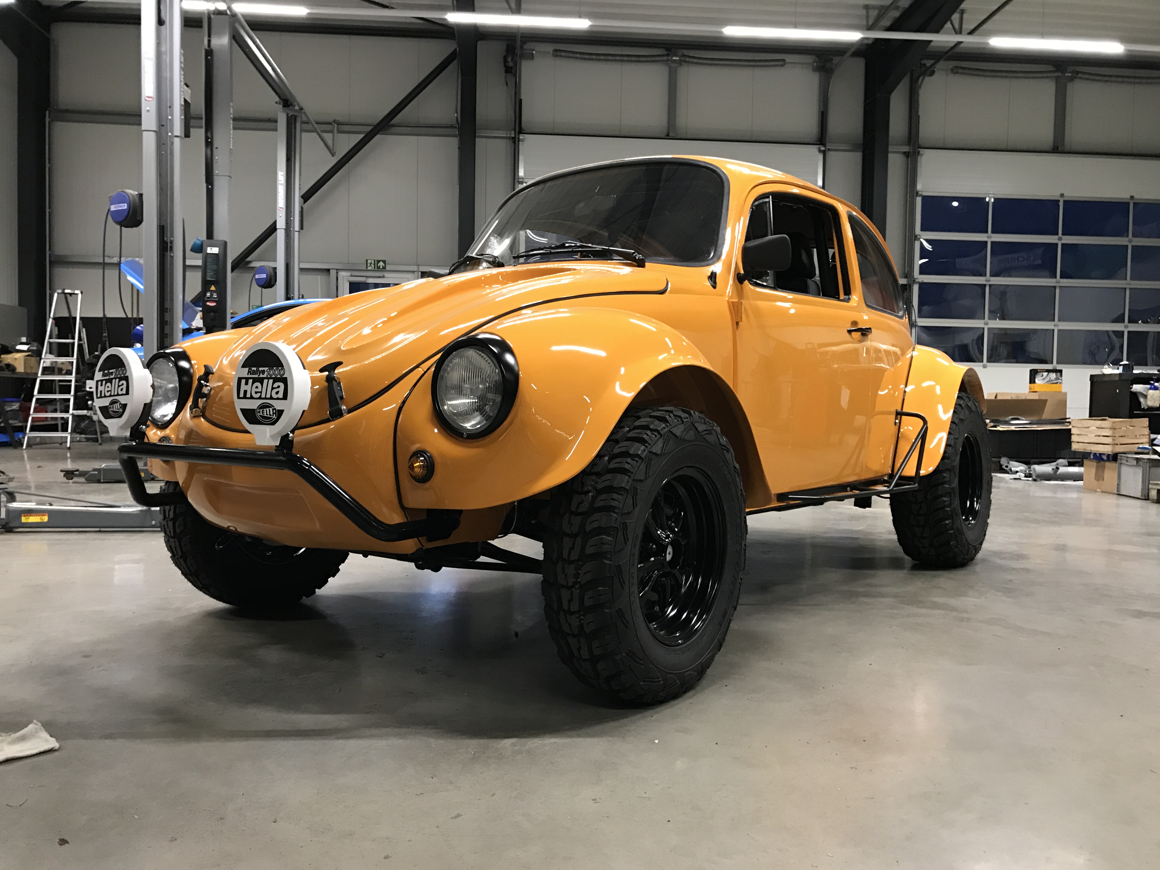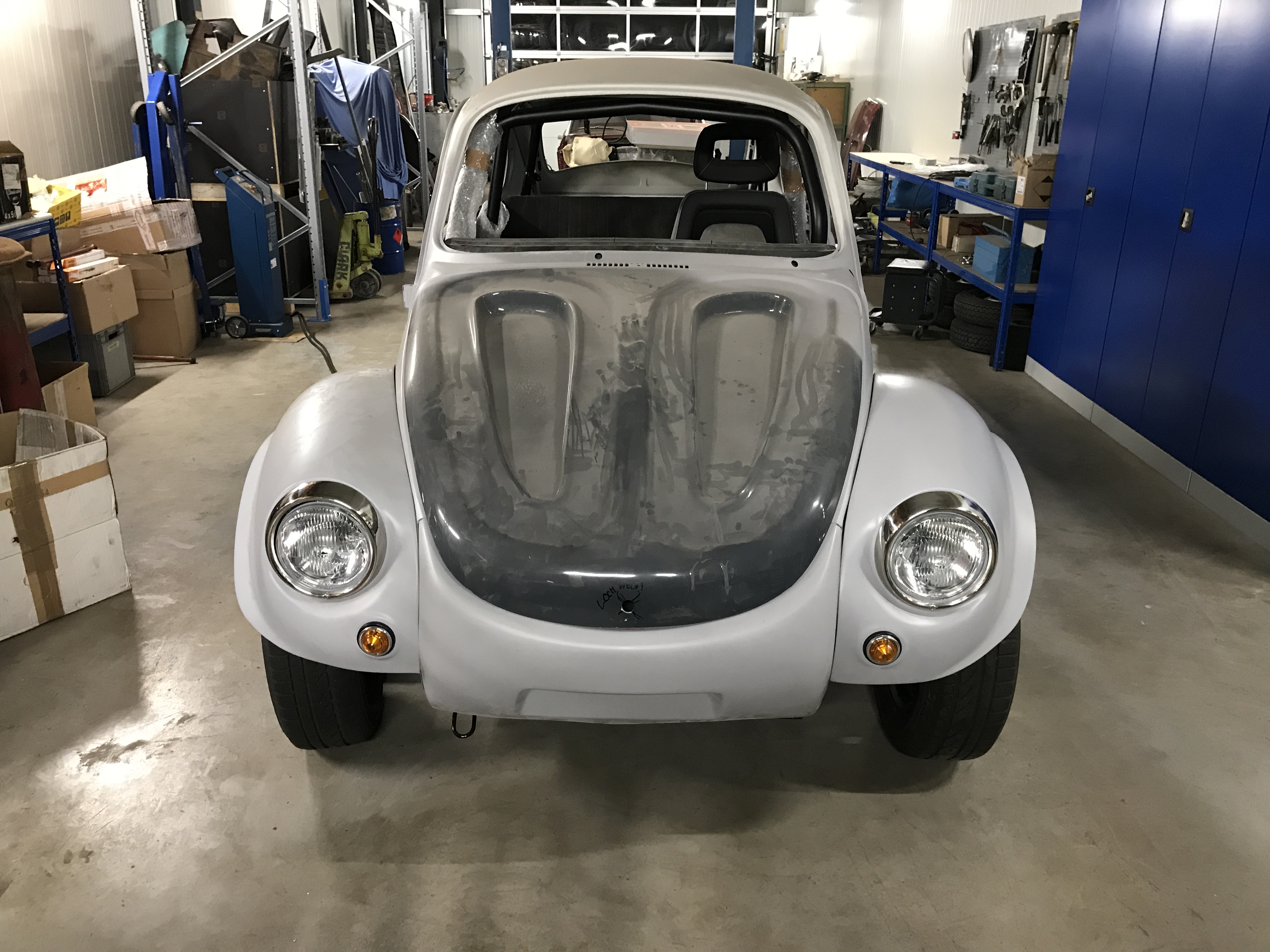 Neuaufbau eines 1303 mit gekürzter Front und Heck, GFK Hauben sowie verbreiterte Kotflügel. Dieses Umbau Kit wurde in den 70er Jahren von der Firma HAZ vertrieben, nur wenige Fahrzeuge haben davon überlebt. Das Basisfahrzeug wurde komplett zerlegt, sandgestrahlt, geschweißt und zum Schluß Epoxid grundiert. Die GFK Teile und Bleche wurden für eine perfekte Passgenauigkeit optimiert.