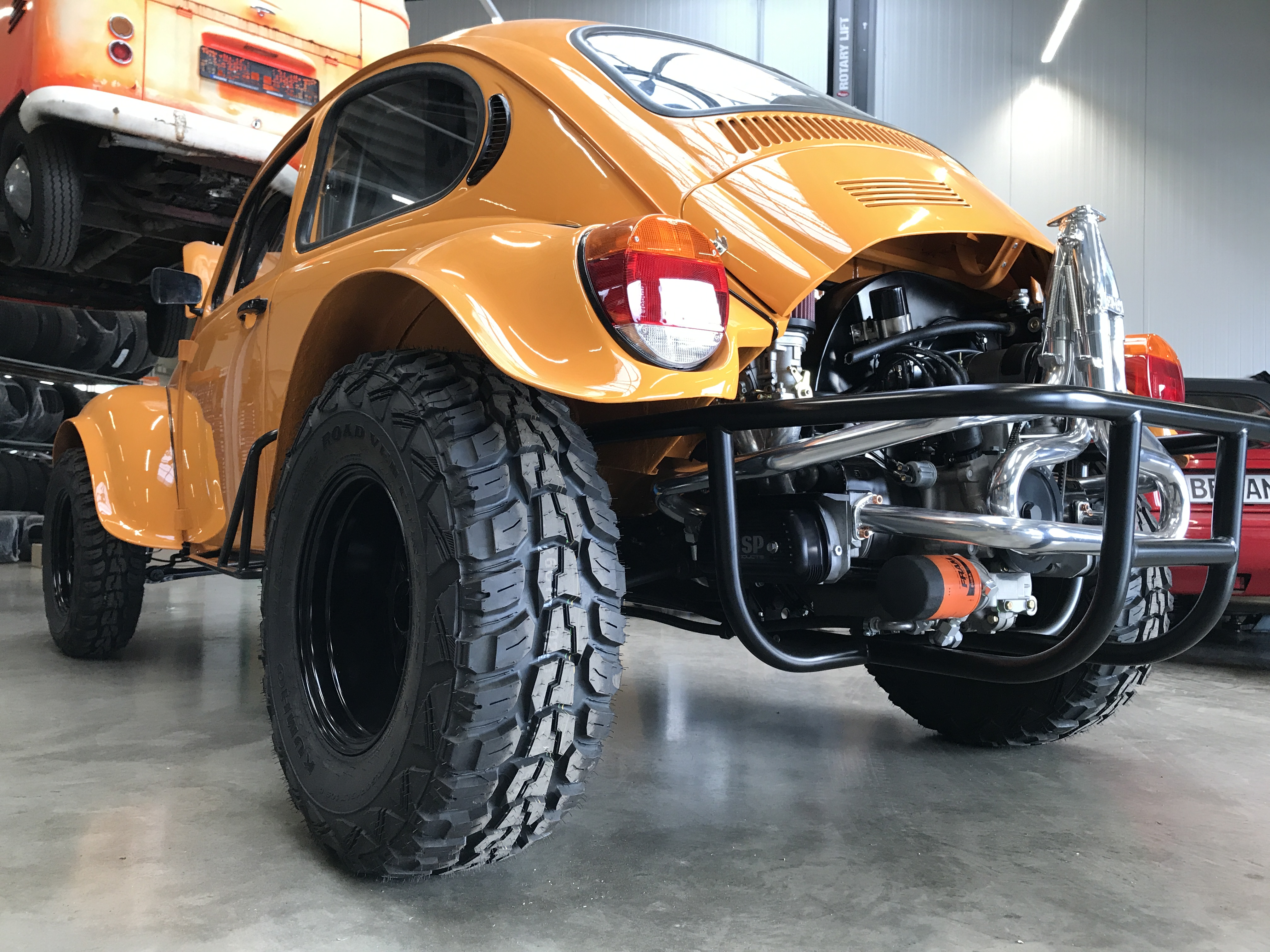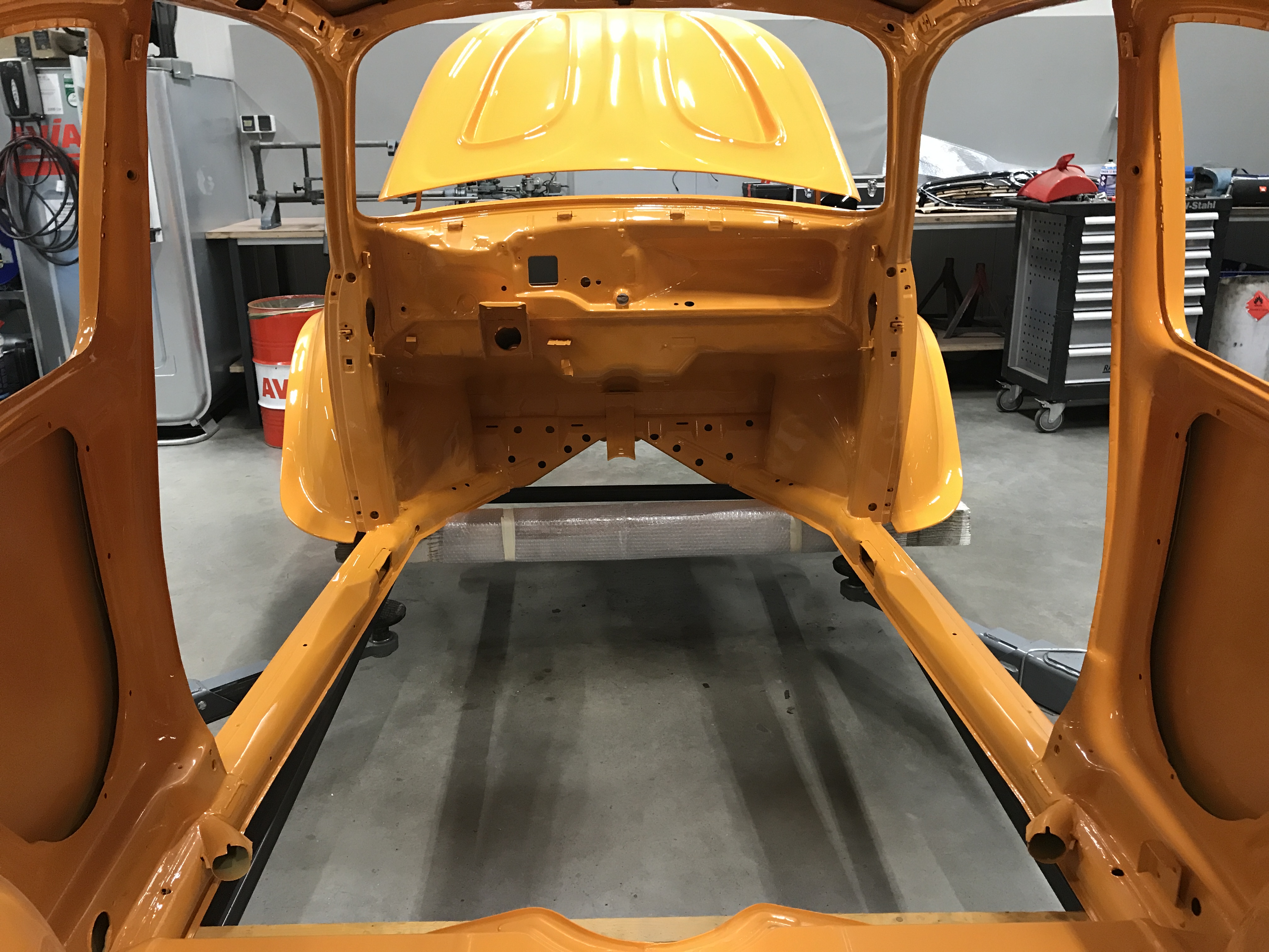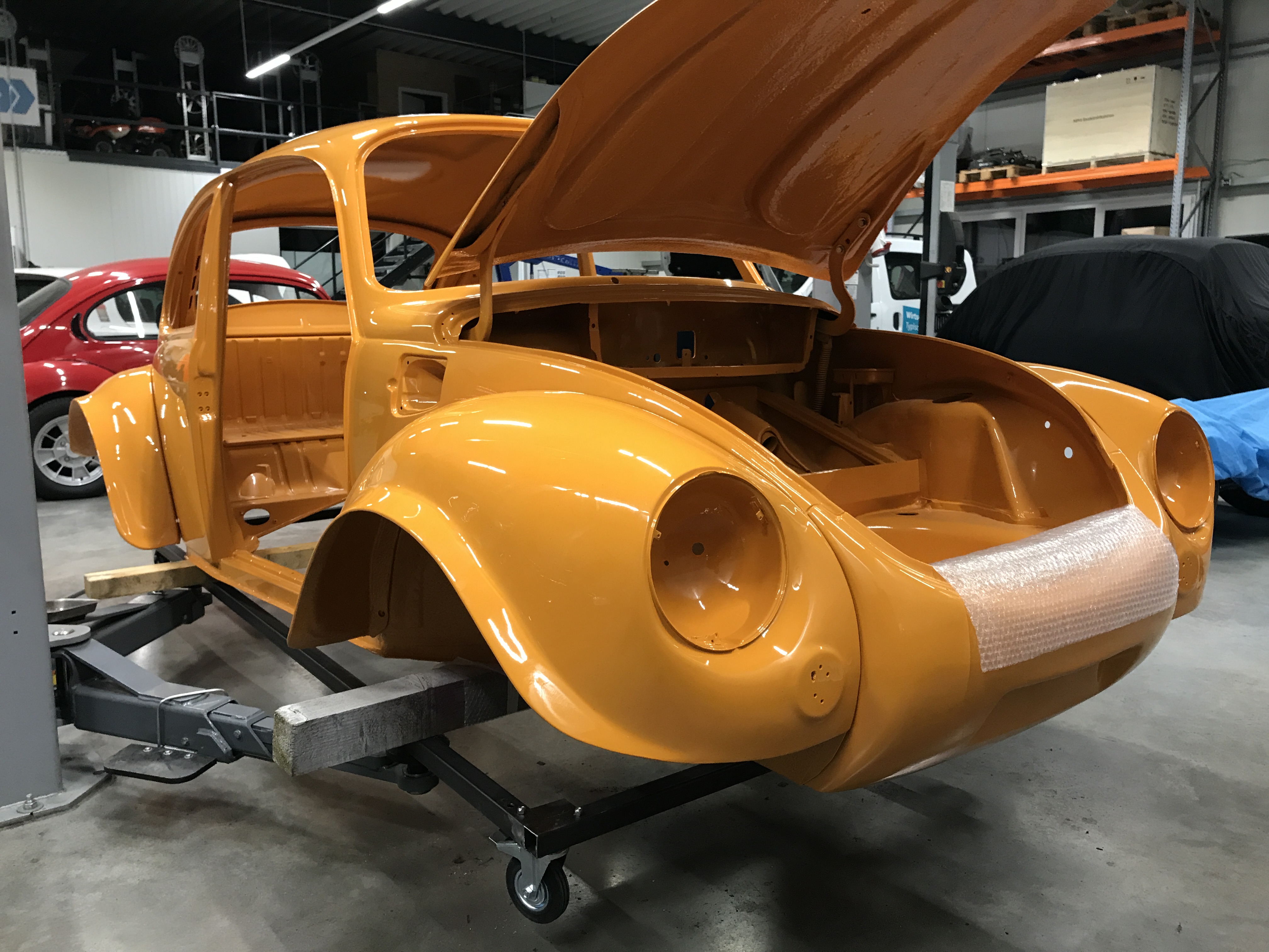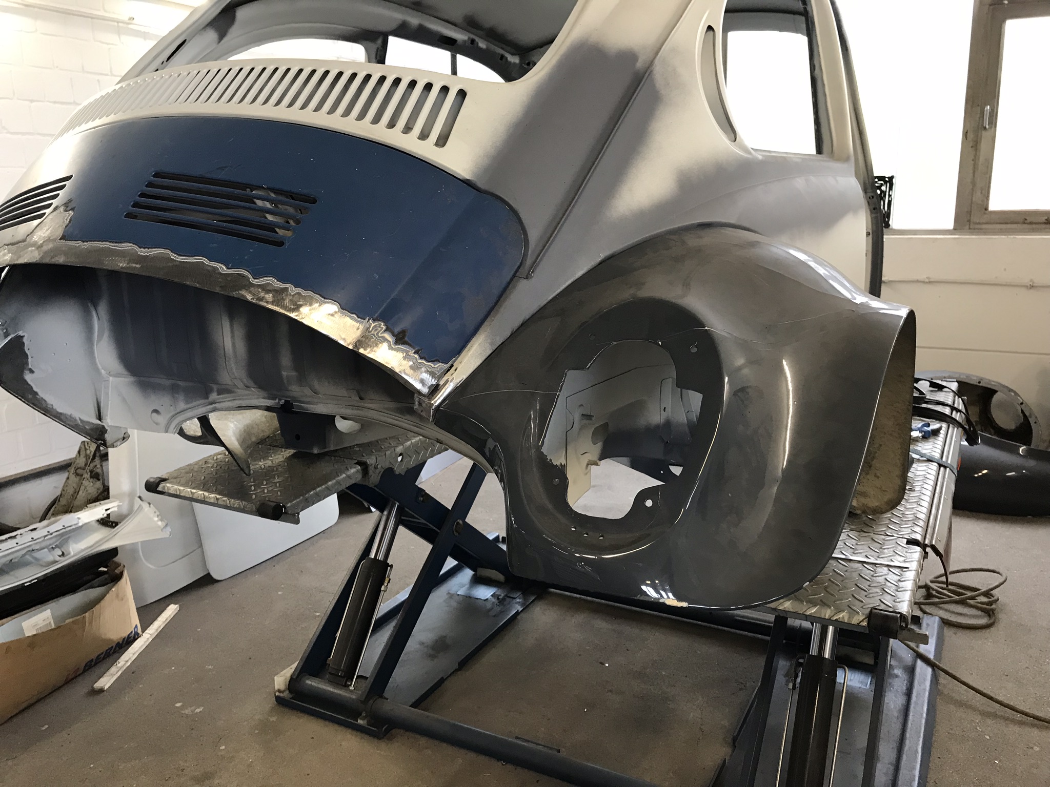 Neuaufbau eines 1303 mit gekürzter Front und Heck, GFK Hauben sowie verbreiterte Kotflügel. Dieses Umbau Kit wurde in den 70er Jahren von der Firma HAZ vertrieben, nur wenige Fahrzeuge haben davon überlebt. Das Basisfahrzeug wurde komplett zerlegt, sandgestrahlt, geschweißt und zum Schluß Epoxid grundiert. Die GFK Teile und Bleche wurden für eine perfekte Passgenauigkeit optimiert.